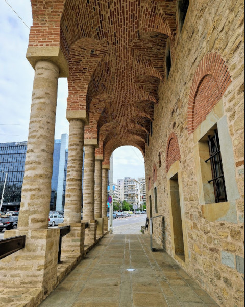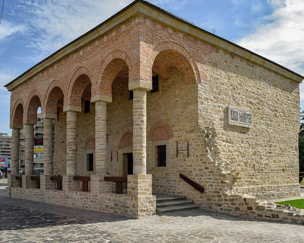 • Su estilo arquitectónico es singular: de factura medieval bizantina, muros de piedra gruesa, forma casi cúbica, techo de poca pendiente y un pórtico con cinco arcadas sostenidas por seis columnas masivas. Todo ello la asemeja a los antiguos locales comerciales del imperio otomano, donde se exhibía mercancía y sus estancias servían de almacén o tienda.