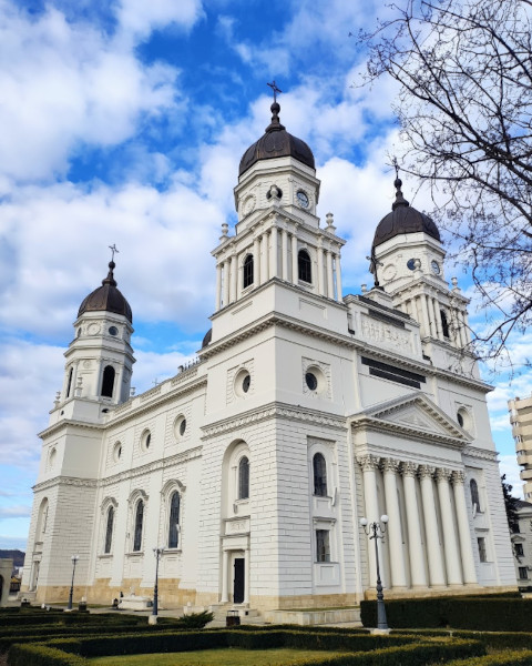 • El diseño inicial neoclásico, obra de los arquitectos vieneses Gustav Freywald y Bucher, experimentó fallos estructurales: en 1857 colapsó el arco central y con él el techo, lo que dejó el edificio inacabado hasta 1880. Bajo la dirección del arquitecto Alexandru Orăscu se eliminó la cúpula central y se añadieron grandes pilares interiores para estabilizar el edificio, transformándolo en una basílica rectangular con tres naves.
