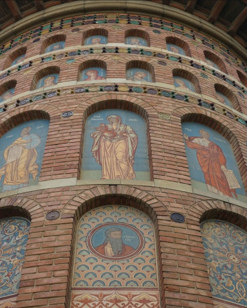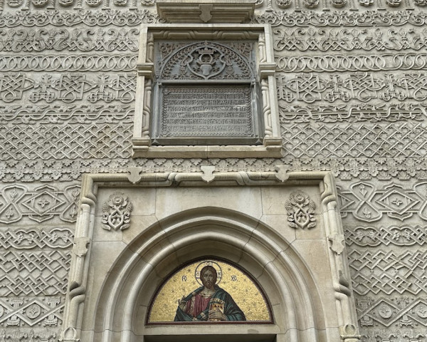• El exterior combina piedra cruda y mampostería de ladrillo, decorada con nichos que contienen 282 rostros de santos y filósofos precristianos, además de discos esmaltados que reproducen sellos moldavos antiguos.
